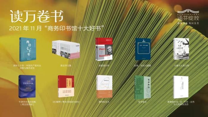 2021年11月“商務印書館十大好書”8日晚在直播間發(fā)布,《兩岸七十年:中國共產(chǎn)黨對臺決策與事件述實》《陳志華文集》《波德萊爾傳》《法律、自由與道德》《元素與人類文明》《牛津?qū)W術(shù)英語詞典(英漢雙語版)》《<紅樓夢>整本書閱讀與研討》《善終的藝術(shù):應對衰老、病痛、死亡的實用指南》《荀學新論》《萊奧納爾多·達·芬奇:自然與人的驚世杰作》入選。