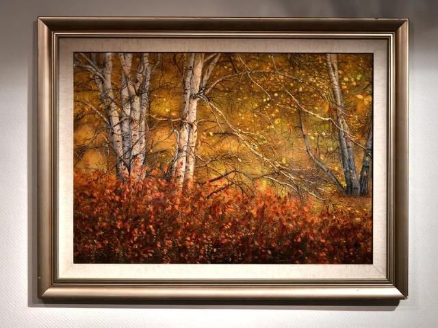 本作品表現(xiàn)的是深秋時(shí)節(jié)森林金黃,白樺樹(shù)落葉點(diǎn)點(diǎn)、露出白色枝干的景象。整體繡面用色豐富多彩,炫而不俗;針?lè)`活多變,層次鮮明,仿佛置身其間,給人以美的享受。