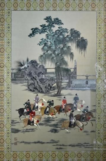 取材于后梁畫(huà)家趙喦所作《八達(dá)游春圖》。八人策馬揚(yáng)鞭于草地間,前者呼,后者應(yīng)。絲縷排列精致細(xì)膩,人物五官不逾寸豆,卻被精巧的一一繡出,神情各異,極為傳神。