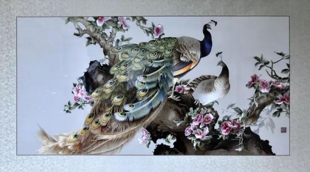 原作是畫(huà)家張玉明的工筆畫(huà)作品。一對(duì)孔雀棲息于爛漫盛開(kāi)的山茶花間顧盼回首,相映成趣。整體繡面繡工精細(xì)、絲光迥動(dòng),將蘇繡精、細(xì)、雅、潔的特點(diǎn)表現(xiàn)得淋漓盡致。