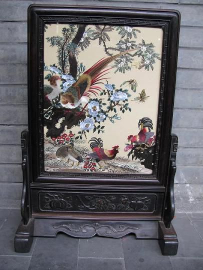 取材于古畫(huà),采用蜀繡的運(yùn)針、輔針、切針、沙針、滾針、打籽針等針?lè)ɡC制。樹(shù)木花草層次分明、古樸自然,錦雞蝴蝶色彩艷麗。