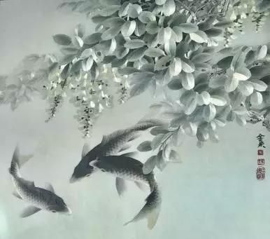 魚(yú)是蜀繡中的代表圖案。該繡品針?lè)?xì)膩,片線光亮,色彩典雅。紫藤花與水中的鯉魚(yú)動(dòng)靜結(jié)合,相映成趣。