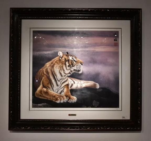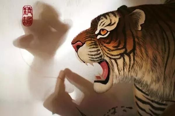 本幅繡品首次成功地將人物肖像圖方式引入傳統(tǒng)走獸刺繡之中。作者用細(xì)膩的針?lè)?xì)致精準(zhǔn)地繡出了老虎根根可辨的絨毛和少女光滑細(xì)膩的皮膚,形成極大的反差,極具視覺(jué)沖擊力。