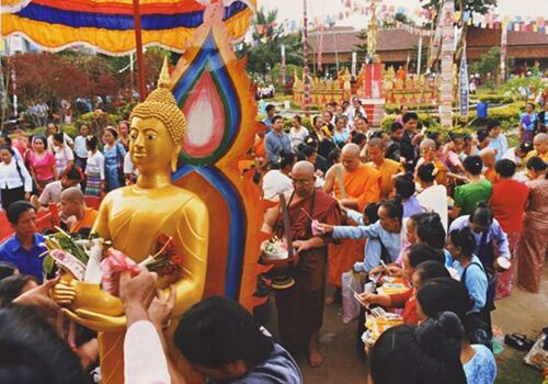 新年潑水是一種禮節(jié),既隆重又熱鬧。除夕那天,人們先到佛寺里,取來(lái)最干凈的清泉(江河)水,采來(lái)最香的鮮花,把花瓣撒在水中,每人取一瓢,用含著花香的清水給佛像沐?。ㄏ笳鹘o佛祖沐浴),祈求來(lái)年平安。儀式舉行完后,人們用樹(shù)枝和鮮花浸水相互淋灑,以示祝福,口中不斷地說(shuō)著“薩瓦沙麗”(吉祥安康)“如利京宛”(幸福健康)。對(duì)長(zhǎng)者只能輕輕地淋灑在肩和背上,表示尊重。到佛寺外和街上,年輕人們就可以潑水狂歡,以示祝福和歡樂(lè)。