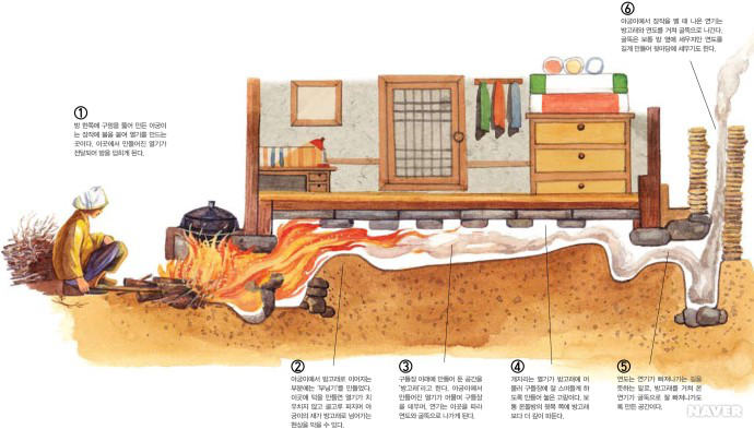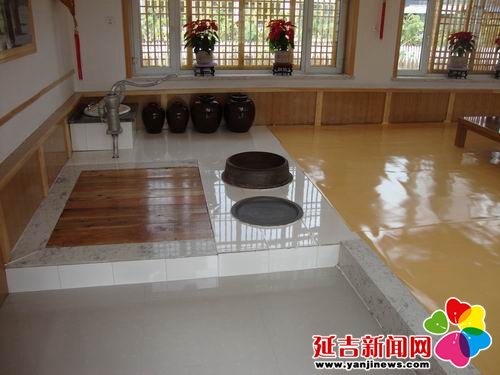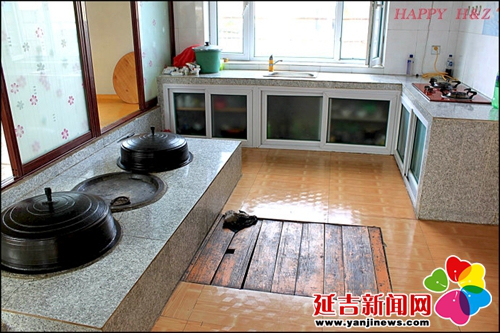 在傳統(tǒng)的朝鮮族民宅中,炕和鍋臺(tái)是平齊的,需要燒火做飯時(shí),主婦會(huì)打開(kāi)架在柜臺(tái)一側(cè)的移動(dòng)木板,下到地面水平線以下的“灶坑”點(diǎn)火做飯。傳統(tǒng)的炕采用長(zhǎng)筒式結(jié)構(gòu),煙火由一洞內(nèi)循環(huán)排出,使每洞都有煙火串入,炕即溫?zé)帷3r族的火坑高度為30-40厘米,但炕洞向下挖入,炕面抹白灰,表面糊油紙或鋪草簾子,炕面平整。隨著物質(zhì)條件的改善,炕面改鋪纖維板或者地板膠,既美觀又耐用。