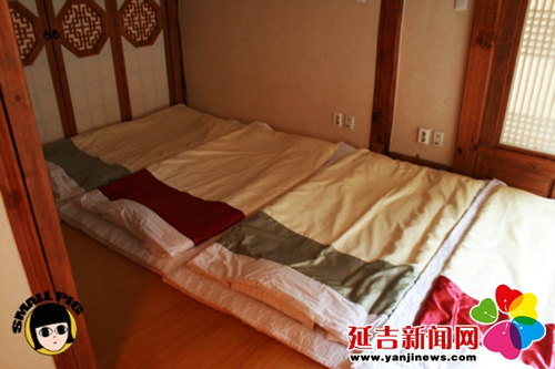 炕是朝鮮族家庭室內(nèi)活動(dòng)的主要場(chǎng)所,吃飯時(shí)女主人會(huì)將食物都擺放在低矮的小餐桌上,搬到炕上全家人席炕而坐,盤腿圍坐一起吃飯。到了晚上,人們還是會(huì)在炕上鋪上被褥睡覺(jué)。因?yàn)榭皇且患胰酥匾幕顒?dòng)場(chǎng)地,所以勤勞干凈的朝鮮族婦女,每日清晨都會(huì)以“擦炕”開(kāi)啟一天的勞動(dòng)模式。