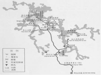 此外,值得一提的新景觀工程還包括對(duì)神山的改造與裝飾。位于祭祀廣場(chǎng)的北頭的山,是村落附近乃至普者黑地區(qū)最高的一座山,半山有一個(gè)天然溶洞就是著名的仙人洞。洞里主要由一個(gè)高20余米面積近100百平方米大穹廬和深淺不一的小洞穴組成,四壁是石鐘乳。進(jìn)入洞內(nèi),看見(jiàn)平時(shí)人們祭祀時(shí)遺留的陶瓷油燈、香爐、香燭、紅布、各色紙?jiān)`物等。據(jù)村民說(shuō),這洞是附近村落居民經(jīng)常前來(lái)祭祀求子的地方。筆者在洞口不遠(yuǎn)處看到用紅漆在石壁上書(shū)寫(xiě)的署名為仙人洞村民委員會(huì)的“安民告示”,[ 安民告示內(nèi)容是:“仙人硐石林美景,不準(zhǔn)任何人破壞,違者罰款拾元”,落款時(shí)間為1987年。]據(jù)村委會(huì)黃先生介紹,目的是為了使該洞的石鐘乳得到保護(hù)并保持該洞作為村民信仰場(chǎng)所的純粹性。然而,2006年春節(jié),筆者在仙人洞洞口左右兩側(cè)所看到的是用青黑色顏料繪制有據(jù)說(shuō)是守護(hù)神的一男一女以及類似飛天的新巖畫(huà),為筆者向?qū)У碾S行村民說(shuō),是文化生態(tài)村項(xiàng)目組專家畫(huà)的。這樣的“創(chuàng)新景觀”巖畫(huà),筆者后來(lái)在該村密枝山上還看到幾處,均出自項(xiàng)目專家的“生產(chǎn)”。原本視為神圣之地,禁止人畜進(jìn)入和隨意攀爬的密枝山,自成為生態(tài)文化村后,為旅游發(fā)展需要,已經(jīng)修建了經(jīng)由歌舞坪通往山頂?shù)氖?jí)道路,登上山頂能將普者黑景區(qū)和仙人洞村一覽無(wú)余。