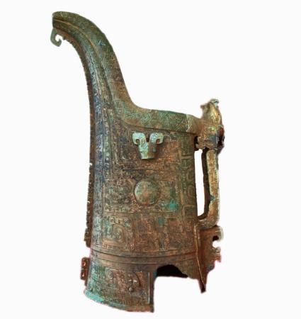 出土時,銅觥側(cè)置平放,銅壺倒置于銅觥內(nèi)。銅觥重13.45千克,器身呈扁圓形??脊艑<曳Q,該銅觥器形獨特,如突出眼睛的變形獸面紋、“C”形扉棱、羊角騰空設(shè)計的平嘴犧首等,與以尊、罍為代表的殷墟時期南方特征青銅器相一致。