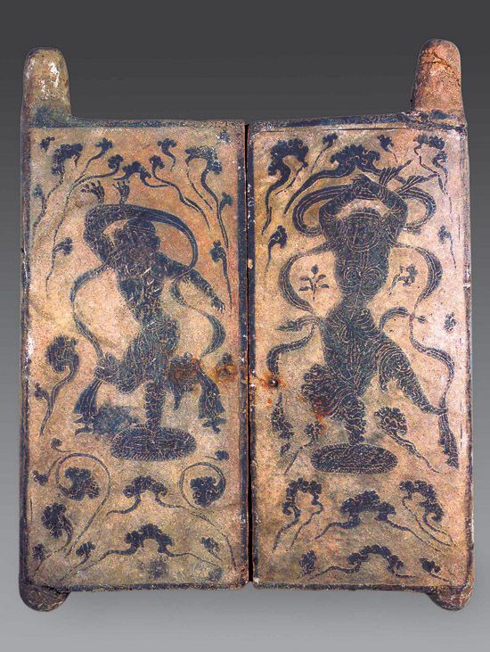 每扇門均呈長(zhǎng)方形,上下有圓柱狀榫,兩門閉合處各有一孔,出土?xí)r有鐵鎖鎖扣。每扇石門正中淺雕一“胡旋舞”男伎。所刻男伎為典型的胡人形象:虬髯卷發(fā),深目高鼻,寬肩細(xì)腰,體魄健壯。身著圓領(lǐng)緊身窄袖衫,下著緊腿裙,腳穿長(zhǎng)筒皮靴,站立在一塊編織精美的小圓毯上,雙人對(duì)舞。舞姿造型略有不同,左邊舞伎側(cè)身回首,左腳站立圓毯上,右腿后屈,左手正微微上舉,右臂屈至頭頂;右側(cè)男伎右腳立毯上,左腿前伸,雙臂上屈,至頭頂上方合攏。兩人均手舉長(zhǎng)巾,熟練揮旋。四周剔地淺浮雕卷云紋,似舞伎騰躍于云氣之中,造成流動(dòng)如飛的藝術(shù)效果。整個(gè)畫面構(gòu)思精妙,主題突出,人物面部表情生動(dòng)自然,體態(tài)輕盈健美,舞姿迅疾奔放、充滿歡樂生活氣息。