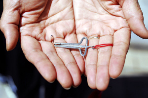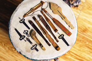 安宇歌介紹,口弦都是純手工制作的,最難制作的部分是能發(fā)音的中簧。制作中簧時(shí),選取原料須是圓形鋼絲,先要將其砸扁,兩邊是尖的,整個(gè)簧的距離由寬到窄,窄的部位向上折彎成鉤,留兩公分長度,再折一小鉤。并且,中簧需高溫淬火,這是一個(gè)難度極高的環(huán)節(jié),全憑手感。如簧不淬火便會(huì)彈性不好,淬過了頭則一彈就碎,淬不到位會(huì)導(dǎo)致彈撥口弦時(shí)所發(fā)的聲音不佳。從某種程度上講,用口弦彈奏的音樂之所以引人側(cè)耳,關(guān)鍵就在這根中簧上。