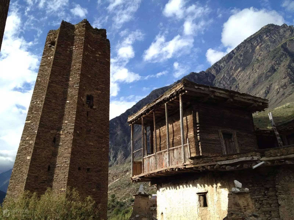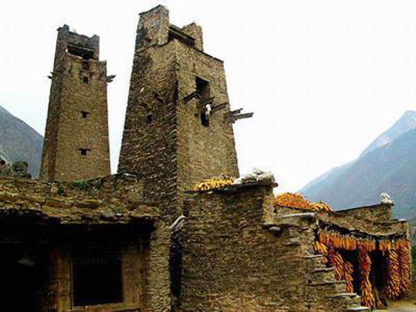 在羌語(yǔ)中,碉樓被稱(chēng)為“邛籠”,意為美麗、高貴的房子,早在2000年前《后漢書(shū)·西南夷傳》就有羌族人“依山居止,壘石為屋,高者至十余丈”的記載。碉樓的高度在十米至三十米之間,用于御敵、貯存糧食和柴草。碉樓有四角、六角、八角幾形式,有的高達(dá)十三四層。建筑材料是石片和黃泥土,墻基深1.35米,以石片砌成。石墻內(nèi)側(cè)與地面垂直,外側(cè)由下而上向內(nèi)稍傾斜。修建時(shí)不繪圖、吊線、柱架支撐,全憑高超的技藝與經(jīng)驗(yàn)。建筑穩(wěn)固牢靠,經(jīng)久不衰。自唐朝來(lái),羌族人民因各種原因向西北遷移,到了西藏和青海,所以現(xiàn)在,羌族碉樓也往往被稱(chēng)為藏族碉樓。