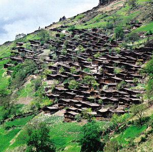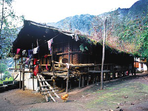 在怒江上游峽谷聚居的傈僳村寨都建在高山的半山上,其民居俗稱為“千腳落地房”。說“千腳落地”雖有些夸張,但也足以形象地說明峽谷溫?zé)岬臍夂蚝蜕礁咂露傅牡乩項l件。在雨季時,“千腳”阻力最小,使山洪順利傾瀉而下,又很快干爽,免受潮氣。而且不需挖地動土,不必移石砌墻,對木料沒有過高要求,長短皆用,在生態(tài)脆弱的高山峽谷也算環(huán)保建筑。“千腳落地”是因建房時先在確定的屋基上依斜坡程度和住房面積打進(jìn)數(shù)十根到百余根木樁為基樁,以保證居室樓板的平正?;鶚洞蚝煤螅拿媪魩赘咧鳛檎麄€房屋的立柱外,在密集木樁所形成的平面上滿鋪竹篾編織的樓板,還有竹篾圍墻,所有結(jié)構(gòu)皆用竹篾綁扎。屋頂鋪苫草或蓋木片瓦,近幾年,已陸續(xù)換上了大塊的水泥波形瓦。房門開在山墻一側(cè),有廊道,可做曬臺,平時穿的衣服都搭在這兒,也是婦女做針線活的地方。隨著怒江峽谷的開發(fā)和新農(nóng)村建設(shè)的深入,通路的村寨將很快會改變面貌。