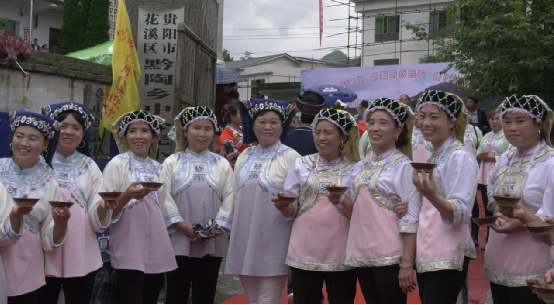 布依族青年們抬著族中神物銅鼓,吹著長(zhǎng)長(zhǎng)的號(hào)角,臉上滿是對(duì)民族節(jié)日的期待之情,驕傲又興奮;成群結(jié)隊(duì)的孩童穿著本民族傳統(tǒng)服飾,手拿錦帶,熱忱歡迎遠(yuǎn)道而來(lái)的客人;能歌善舞的布依阿姐笑臉相迎,唱著布依族的歌謠,一字排開(kāi)堵在門(mén)前,客人們想要進(jìn)去參加這次盛會(huì),就得過(guò)三關(guān),干了三碗攔路酒。