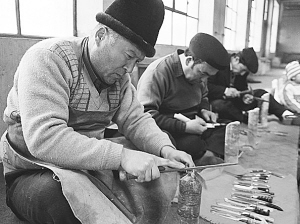 最后一道工藝,在過去算是秘密,現(xiàn)在已經(jīng)眾所周知,就是用油煮、蠟磨的方法使小刀光亮,不生銹。