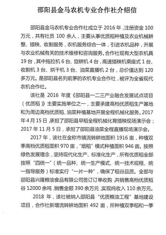在農(nóng)機(jī)專業(yè)合作社的幫助下,當(dāng)?shù)剞r(nóng)業(yè)生產(chǎn)過(guò)程的機(jī)械化程度非常高。邵陽(yáng)縣金馬農(nóng)機(jī)專業(yè)合作社,位于邵陽(yáng)縣金稱市鎮(zhèn)石馬村,主要提供組織農(nóng)業(yè)機(jī)械耕整、插秧、收割服務(wù),大大提高了當(dāng)?shù)氐姆N植和生產(chǎn)效率。
