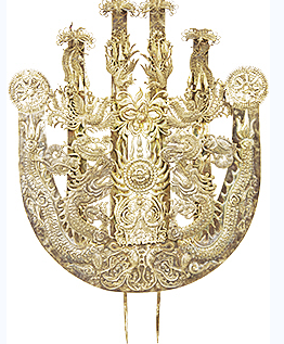而最為極致的演繹,則要屬黔東南地區(qū)的苗族“盛飾”:黃平苗族的球形銀鳳冠,銀冠之上布滿銀花,蝴蝶、螳螂、雀鳥等動(dòng)物形象立于花間,一派生機(jī)。銀冠下緣飾有響鈴,行動(dòng)時(shí)搖曳生姿、聲色俱美;雷山西江苗族的大銀角,寬近1米,立高可達(dá)70厘米左右,面上鏨刻有雙龍搶寶的主紋,兩端尖角處可插羽毛或彩線,中央插有一把銀扇,既像鳥羽,又似太陽放射出的光芒……