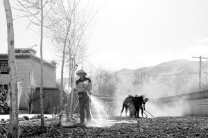 茶館老板正在修建房屋前的草坪。
