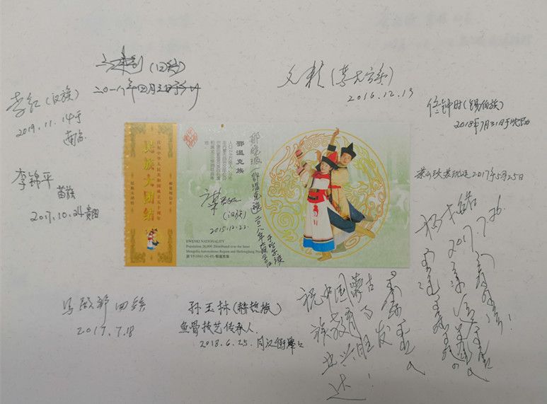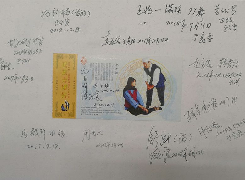 在采集口述影像錄音資料的同時,項目組還收集了大量的珍貴歷史照片以及相關文物。值得一提的是,他們設計了一種非常有特色的受訪者簽名簿,中間貼著繪有56個民族的音樂舞蹈圖案的首日封或明信片,四周簽上受訪者的人名簽名字、民族特征,有些還用民族文字書寫,體現了中華各民族團結在一起的精神風貌。簽名簿有厚厚的幾大本,設計精美,承載著民族工作口述史資源采集的經歷,具有豐富的文化內涵和博物館收藏價值。