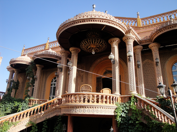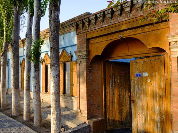 維吾爾族的居室一般是土木結(jié)構(gòu)平房,其建筑方式是以粗木或沙石作基,土塊砌墻,或笆子墻,房頂架梁檁、椽后鋪葦席加土抹泥。房屋平頂,開天窗采光,四壁不開窗只留門,房門忌朝西?,F(xiàn)在,建筑式樣發(fā)生變化,多留壁窗,建材也多由土木結(jié)構(gòu),向磚、混凝土結(jié)構(gòu)發(fā)展。室內(nèi)布置過去較為簡單,一般多砌土炕,炕一側(cè)隔矮墻砌鍋臺,墻上留有壁翕,放置物品,喜掛壁毯。冬季多燒爐子、火墻取暖。院內(nèi)多植有葡萄和果樹花卉。房門口兩側(cè)砌土臺,上鋪氈毯,用以夏天乘涼、睡覺。