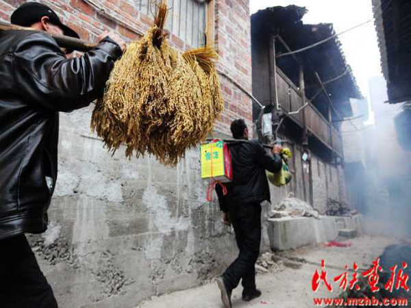 賀禮是街坊鄰居送給新娘家的禮品,在婚禮結(jié)束后的第一天下午進(jìn)行。送賀禮由中老年婦女承擔(dān),送時或單獨(dú)或結(jié)伴而行,禮品或手提或裝在竹筐里,一般都要帶上若干份,每戶一份,一次送完。禮品送到新娘家后,新娘家要進(jìn)行登記并送幾塊餅干糖果以表謝意。