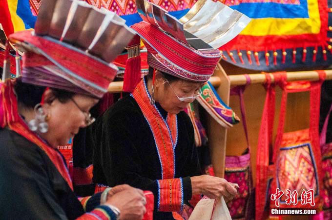 12月6日,在中國瑤族之鄉(xiāng)廣西金秀瑤族自治縣的盤王節(jié)上,當?shù)乩弦惠叕幾鍕D女展示瑤族織繡