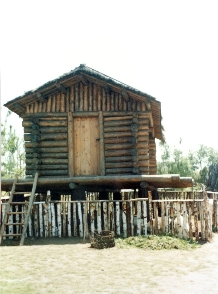 早期,每一個家族公社都有一個公用的高腳倉庫,鄂倫春語叫“歐倫”,一般是在游獵的中心地帶,選擇四棵自然生長、成對角的樹,在距地面約3—4米高的地方留一個樹杈,砍掉其余的樹頭,樹杈上架兩根直樹干,樹干上面一根挨一根地平鋪木桿成為底座,底座上用木桿壘一個“木刻楞”小房或用樹枝做一個半圓形的架子,覆蓋樺樹皮,然后用藤條或樹皮綁縛固定。一側(cè)留有進(jìn)出的小門,借助木梯上下,為防止野獸攀上糟蹋東西,平時都把木梯放倒在一邊。這種倉庫主要存放一些暫時吃不了和用不著的食品和雜物,搬遷時不拆除,里面的東西也不帶走,什么時候需要再騎馬來取。個體小家庭獨(dú)立以后,公共庫房變成了私家財產(chǎn)。雖說是私家財產(chǎn),卻從不留人看守,也不上鎖。獵人在外打獵,如果一時斷糧,可以不經(jīng)主人允許,隨便到任何一家的“歐倫”中拿走所需要的東西,事后向主人通告一聲即可,以后有了如數(shù)奉還,不還主人也不索要。