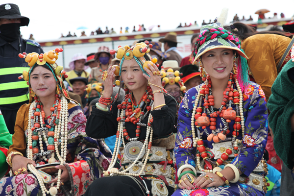 甘、青、川的藏族男子非常講究腰飾,有財力的男子一般都有一條鑲有僅、銀、玉的寬皮腰帶,腰帶上還掛有裝飾性的小刀、火鐮等。青海玉樹地區(qū)的婦女裝追求華麗,內(nèi)衣外袍色彩艷麗,綢緞腰帶留長飄帶,頭、頸、發(fā)、腕、指和腰佩有金、銀、玉、珊瑚、瑪瑙等珍貴飾品,一套豪華女裝價格不菲。因此有諺語:“男人的財富系在腰上,女人的嫁妝穿在身上”之說。云南藏區(qū)的女裝上身穿長袖彩綢衫,外著無袖大襟長袍,長袍領(lǐng)口、襟邊和下擺鑲有錦緞,色彩艷麗。云南一些藏區(qū)的女子喜歡穿百褶裙,顯示出女性的優(yōu)美身材。西藏工布地區(qū)的女裝顯得簡約,先穿有袖內(nèi)衣,再將氆氌拚縫成大片,中間挖一圓口,穿時將頭伸進(jìn)圓口兩端垂與胸背,再束腰帶即可。藏族婦女的頭飾也很多,有碎辮的、有戴頭巾的,有盤發(fā)的,西藏山南地區(qū)的巴珠最有特點。巴珠是三枝狀,平系于頭頂兩枝向前,將分梳的兩條發(fā)辮分別盤于兩枝上。其上部還有一弓形物,與三枝狀兩端連接,上系絲織品,邊緣鑲珍珠、珊瑚等。女子13歲戴巴珠,象征已經(jīng)成人。金邊帽也很有特色,藏區(qū)的男女都戴。帽型為桶狀,周邊鑲織錦,內(nèi)有四片耳片,兩大兩小,天冷時放下耳片護(hù)耳。狐皮帽形似倒掛的金鐘花,以布作底層,再縫上狐貍皮,帽后有兩條長飄帶。男帽稍高,女帽較低。