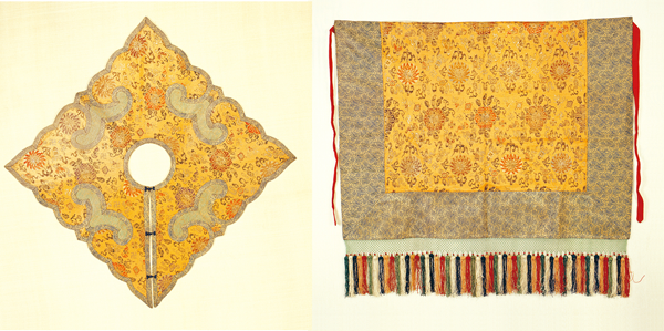 圖為清代藏傳佛教僧人法衣(桔黃地寶相花織錦披肩與織錦裙),中央民族大學(xué)民族博物館館藏