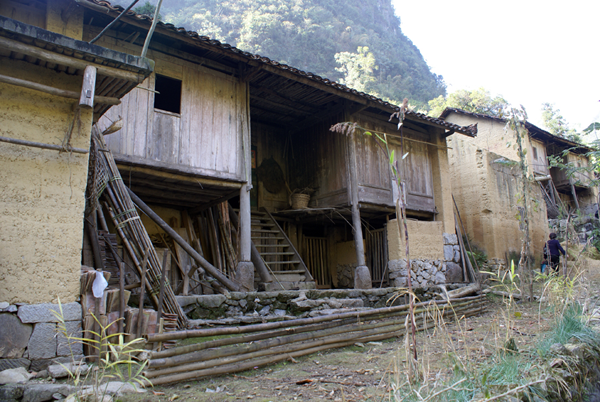 干欄石屋(亦稱干欄石樓)為進(jìn)入20世紀(jì)后多數(shù)農(nóng)民的住屋,是凹形矮腳石木結(jié)構(gòu)干欄式,因墻基用石頭砌成而得名。上層住人,下層圈養(yǎng)牲畜及堆放農(nóng)具和柴草,可以防潮。整棟房為石基、泥墻、木柱、瓦頂。每棟以用銜條數(shù)和間數(shù)多少區(qū)別大小。從屋頂?shù)轿蓍軆蛇?,?3根銜條的叫檐十三,用15根的叫檐十五,以此類推。檐十三屋內(nèi)較窄,不便擺放家具雜物;檐十九較寬敞,但屋檐低矮,室內(nèi)陰暗。以檐十七居多,屋里寬敞,通風(fēng)采光也良好。多為三、五、七、九間,大門居中,兩邊對(duì)稱。