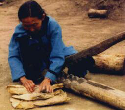 圖八 圖九 赫哲族婦女用木鍘刀熟魚(yú)皮 將熟好的魚(yú)皮連成大片
