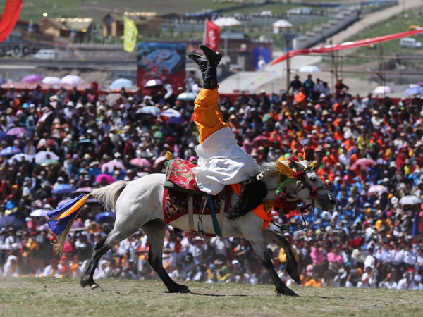 馬上運(yùn)動驚險刺激,是藏族人民非常喜歡的運(yùn)動,每當(dāng)舉行賽馬活動,親朋好友都要前去助陣,得勝者都有獎勵,親戚朋友還要為得勝的主人和馬披紅掛彩。