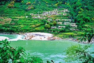 在怒江上游峽谷聚居的傈僳村寨都建在高山的半山上,其民居俗稱為“千腳落地房”。說“千腳落地”雖有些夸張,但也足以形象地說明峽谷溫?zé)岬臍夂蚝蜕礁咂露傅牡乩項l件。在雨季時,“千腳”阻力最小,使山洪順利傾瀉而下,又很快干爽,免受潮氣。而且不需挖地動土,不必移石砌墻,對木料沒有過高要求,長短皆用,在生態(tài)脆弱的高山峽谷也算環(huán)保建筑?!扒_落地”是因建房時先在確定的屋基上依斜坡程度和住房面積打進(jìn)數(shù)十根到百余根木樁為基樁,以保證居室樓板的平正?;鶚洞蚝煤?,除四面留幾根高柱作為整個房屋的立柱外,在密集木樁所形成的平面上滿鋪竹篾編織的樓板,還有竹篾圍墻,所有結(jié)構(gòu)皆用竹篾綁扎。屋頂鋪苫草或蓋木片瓦,近幾年,已陸續(xù)換上了大塊的水泥波形瓦。房門開在山墻一側(cè),有廊道,可做曬臺,平時穿的衣服都搭在這兒,也是婦女做針線活的地方。隨著怒江峽谷的開發(fā)和新農(nóng)村建設(shè)的深入,通路的村寨將很快會改變面貌。