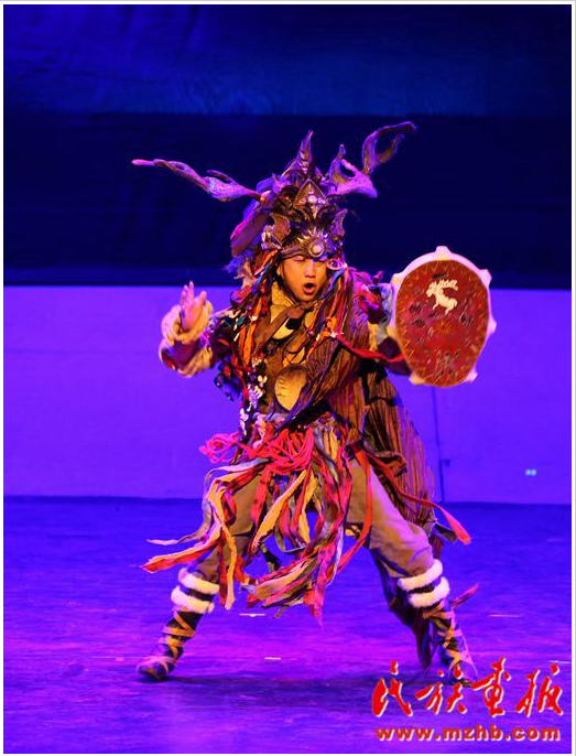 大型原創(chuàng)民族歌舞詩劇《山嶺上的人——鄂倫春》在國家大劇院上演,圖為歌舞詩劇第一幕《山語》之情景表演《圖騰印象》