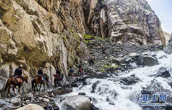 喀拉塔什其木干村村民馱隊沿著崎嶇的山路前往夏牧場