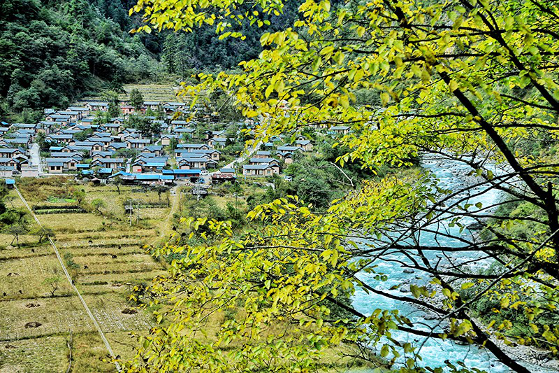 熊當(dāng)村遠(yuǎn)眺。熊當(dāng)村是獨(dú)龍江鄉(xiāng)最北的村子,與西藏接壤,如今已完成了安居重建