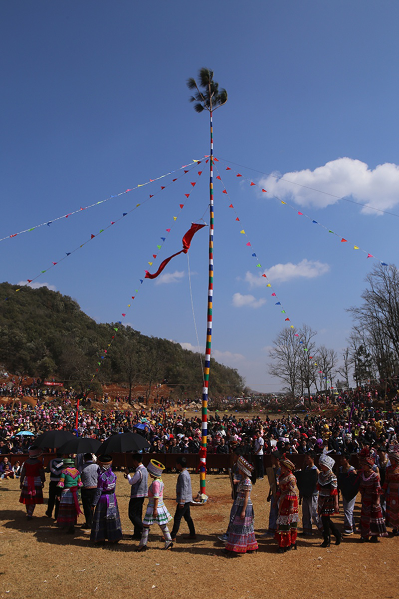 節(jié)日承載著民族的歷史文化和共同記憶?;U祭祖的儀式便是一種活態(tài)的歷史敘事和傳播,分為立桿、祭桿和收桿。立桿是在節(jié)日開始前,選兩棵異體同根、高而直的松樹,一公一母,擇吉日把花桿頭朝著太陽升起的東方豎起來,立在花山場。苗族人認為祖先居住的地方是太陽升起的地方。祭桿時由村中長老和巫師帶頭,圍繞花桿順時針方向走三圈,同時獻上祭品,念頌咒語,祈愿祖先保佑。收桿是在節(jié)日結(jié)束時將花桿頭朝日落的方向放下,人們會搶著摘一把松枝回家,求子求福、保佑平安,放下的花桿將被村民妥為保存。