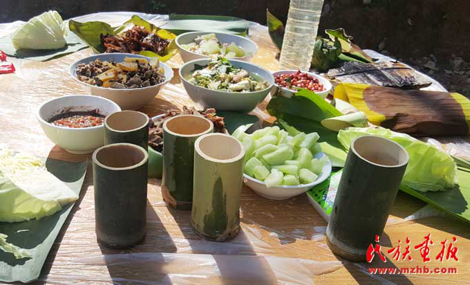基諾族地區(qū)食材豐富,一日三餐,以大米為日常主食,雜以玉米、瓜豆等。每年5—9月的雨季,基諾山漫山遍野是食材,山藥、水芹菜、竹筍、魚腥草及各種菌類等無污染且很新鮮,是難得的烹飪材料,經(jīng)過簡單處理就成為餐桌上的美味佳肴?;Z族民間有句俗話,叫“漢炒、傣蘸、基諾舂”,也就是說漢族人喜歡吃炒菜,傣族的菜喜歡蘸著調(diào)料吃,基諾族的菜則以臼舂為主?;Z族的肉類的吃法較多,可以腌成干巴,也可吃新鮮的。酸腌魚、涼拌茶也是基諾族的最愛,基諾人做飯就餐均在竹樓二層的火塘周圍進行,有一定的禮節(jié)和講究?;Z族吃飯時,主人首先要在火塘東側(cè)獻一點飯菜祭祀祖先和灶神,吃飯時全家人按順序在火塘旁圍蔑桌而坐,家長正對火塘,客人靠火塘而坐。