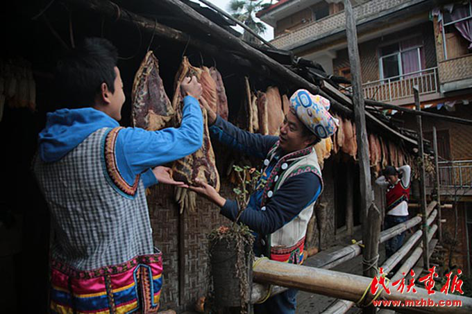 郁伍林和兒子郁樂選取怒族特色食材之一琵琶肉(臘肉)