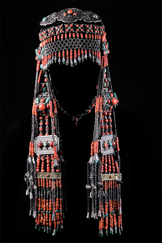 頭箍飾:是整個(gè)頭箍是頭飾的中心骨架,也是頭飾的中心飾件,飾于頭圍,呈圓扁形環(huán)狀飾帶, 多以青色綢緞布打成袼褙后剪制成底襯, 與頭圍周長相吻合。在其表面以綢面貼飾,再依個(gè)人愛好在頭箍外緣表面上, 釘綴銀托。銀托可分三種:其一為圓形鏨花掐絲云紋銀托,其銀鏨花中間為圓形環(huán)飾, 間鑲嵌呈半圓體形紅色珊瑚珠,由白色銀鏨托飾托起, 釘綴在青色綢箍之上, 青、白、紅相映, 艷麗無比;其二在銀鏨托花飾正中,有一個(gè)較大的銀鏨托花正好飾在額前雙眉之上,呈桃形銀鏨托花,上鑲嵌半圓體形珊瑚珠,并在珊瑚珠周圍鑲嵌葉片形綠松石珠,從整體造型來看似一串水晶般紅綠葡萄在額前閃耀, 十分華麗;其三在前額頭箍處, 于半圓形浮雕式的銀鏨花托間隔金剛杵形銀托座, 在托坐之上鑲嵌長圓柱形的珊瑚珠, 美觀莊嚴(yán), 具有宗教含義。
