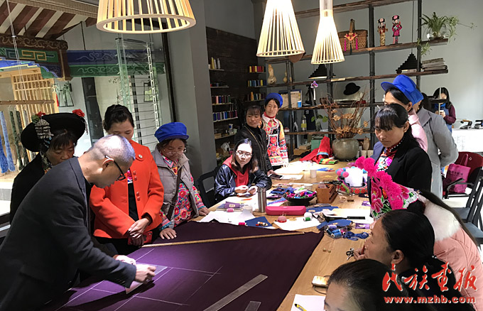 在古色古香的云南省楚雄市彝人古鎮(zhèn),排排具有民族風情的街鋪門面中,有家令人耳目一新的店面,僅是它素雅的名字和文藝的裝修,就不斷吸引著路過的游客前去一探究竟,這就是楚雄索玉文化美學創(chuàng)意有限公司工作室的所在地?!昂芏辔乃囆∏嗄赀M店后,被我們家精致的創(chuàng)意彝繡飾品和服飾所吸引,拿起來愛不釋手?!彼饔竦脑O計師盧潔瑩說道。盧潔瑩的氣質就如工作室的布置風格一樣,溫文儒雅又落落大方,她身穿一身自己設計的彝繡服飾,正俯身指導著員工。