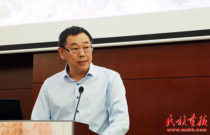 中國少數民族電影工程領導小組辦公室副主任、宣傳推廣部主任,中國民族影視研究中心主任牛頌主持研討會