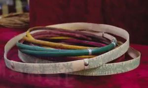 直到今天,腰箍仍在德昂族服飾中占有重要位置。按德昂人的習(xí)慣,姑娘成年后,就要在腰部佩上若干腰箍。這些腰箍大多用藤篾編成,藤圈寬窄粗細(xì)不一,有的漆成紅、黑、綠等色;有的刻上花紋,包上銀皮、鋁皮;還有的一半是藤篾,一半是銀絲。姑娘們以腰箍多、腰箍美為榮。因此,在戀愛期間,小伙子為了討姑娘歡心,往往費(fèi)盡心機(jī)地制作精巧的腰箍相贈。腰箍從傳說的用來“拴住人”,演變成為用來“拴住心”。