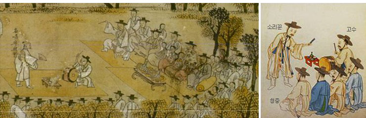 盤嗦哩通常由一人演唱,另一人用鼓伴奏。這種形式大約在18世紀中朝鮮王朝后期開始出現(xiàn),19世紀末是它的黃金時代。關于它的起源有兩種不同的看法,一種認為它是18世紀的游浪藝人根據(jù)某種戲劇創(chuàng)造的,另一種則認為是來源于薩滿教儀式中的歌曲。盤嗦哩的故鄉(xiāng)是韓國全羅北道的南原,至今那里仍盛行這種演唱。
