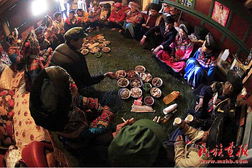 穿長衫,戴著包頭的新郎,把新娘接入正堂屋,將送親的人群迎進(jìn)臨時搭建的青棚屋休息。青棚,是傈僳族人辦婚事時砍來毛櫟樹、香樹枝等臨時搭起的棚子。既清新又涼爽舒適??梢杂脕斫哟e客,也可以作為跳舞、唱曲子的活動場所。晚餐就在青棚里進(jìn)行,宴席一般不用桌子,酒菜擺在青棚下面鋪好青松毛的地上,客人八個一圈,席地坐在青松毛上,圍著喜筵,既歡樂又開心的喝著美酒、品嘗佳肴。晚飯菜肴十分豐盛,足見主人家的好客和廚師的高超手藝。菜出雙不出單,菜的顏色出紅不出白。一切都象征著成雙成對,吉祥如意。