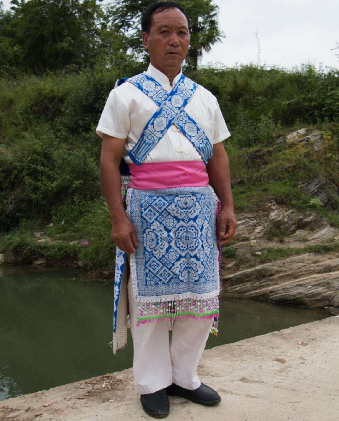 谷立村男子服飾相對(duì)于苗族女子服飾則顯得較為簡(jiǎn)樸,男子上身主要穿著白色打底的對(duì)襟衣,身后背有背牌,背牌底色為藍(lán)色,上繡有花朵圖案作為裝飾。下身主要以藍(lán)色打底的圍裙為主,身前圍裙,上面布滿刺繡圖案。身后的圍裙則為一條條獨(dú)立的絲帶,絲帶上同樣布滿花紋刺繡圖案,在其底部還串有珠簾作為裝飾。