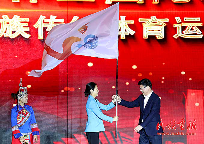 國家民委監(jiān)督檢查司司長隋青向運(yùn)動會授旗。