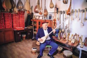 民族樂器制作技藝(維吾爾族樂器制作技藝)國家級(jí)傳承人艾依提·依明在家中樂器陳列室演奏民族樂器。新華社記者 張曼攝
