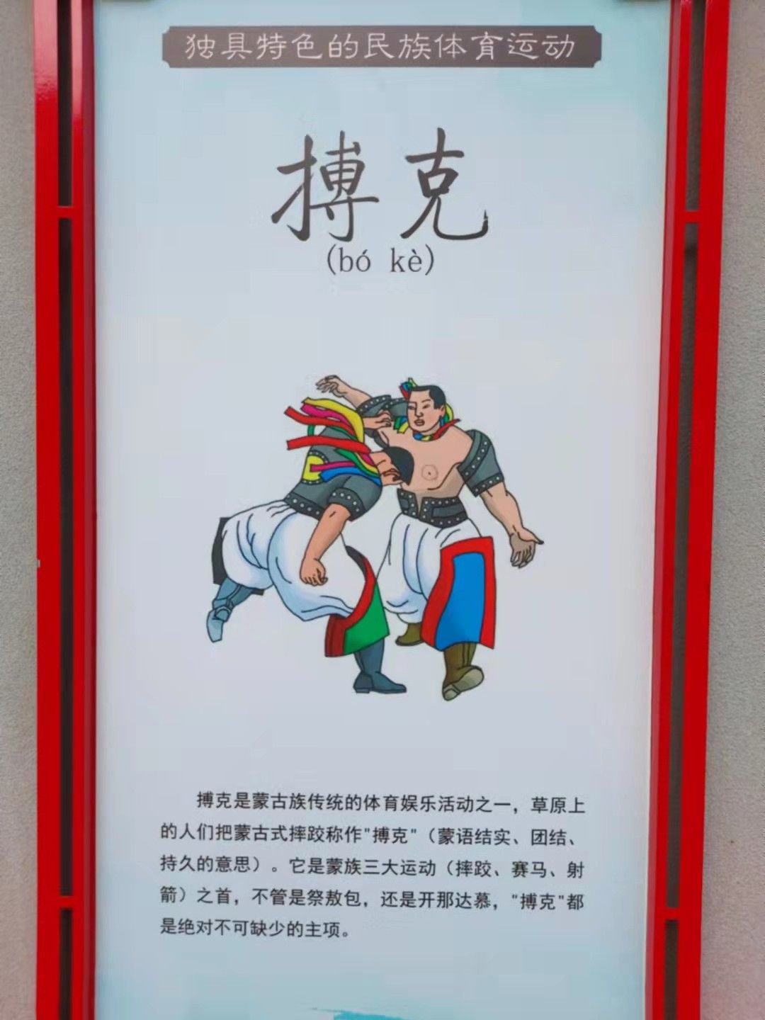 搏克是蒙古族傳統(tǒng)的體育娛樂活動(dòng)之一,草原上的人們把蒙古式摔跤稱作"搏克”(蒙語結(jié)實(shí)、團(tuán)結(jié)、持久的意思) .它是蒙族三大運(yùn)動(dòng)(摔跤、賽馬、射箭)之首,不管是祭敖包,還是開那達(dá)慕,"搏克"都是絕對(duì)不可缺少的主項(xiàng)。