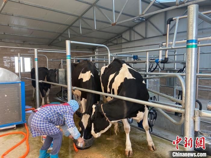 圖為工作人員正在照顧奶牛?!∈茉L者供圖