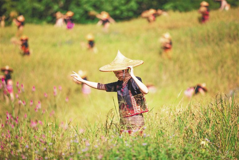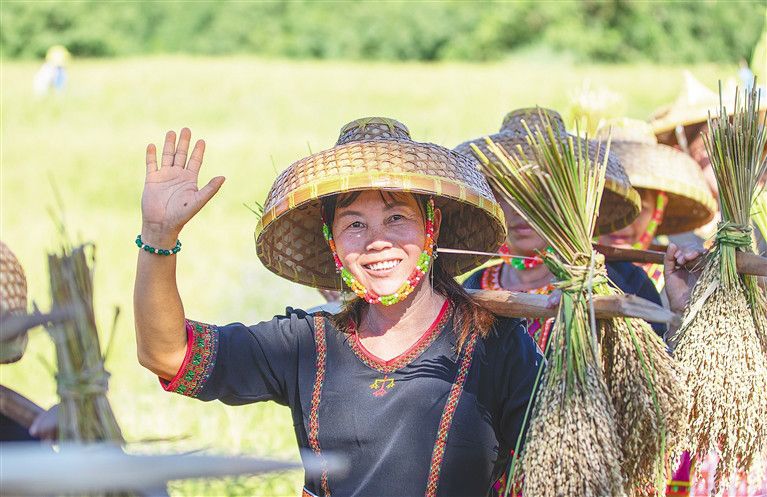 “砍山種植山蘭稻,一定要成功,煮好山蘭米,釀好山蘭酒,邀來親朋與好友,同慶好豐收……”當天,在位于霸王嶺下的青松鄉(xiāng)擁處村的山坡上,一串串飽滿的稻穗已壓彎了稻稈;此時,農(nóng)戶們?nèi)褰Y(jié)伴爬上山坡,弓下腰身麻利地揮動著手中的鉤刀開割稻稈,在辛勤勞作之時,還不忘哼起黎族歌謠分享著又是一年山蘭好收成的喜悅。山坡上辛勤勞作的喜悅,與正在山腳下舉辦的“啦奧門”山蘭文化節(jié)的喜慶氛圍達成了同一節(jié)拍。